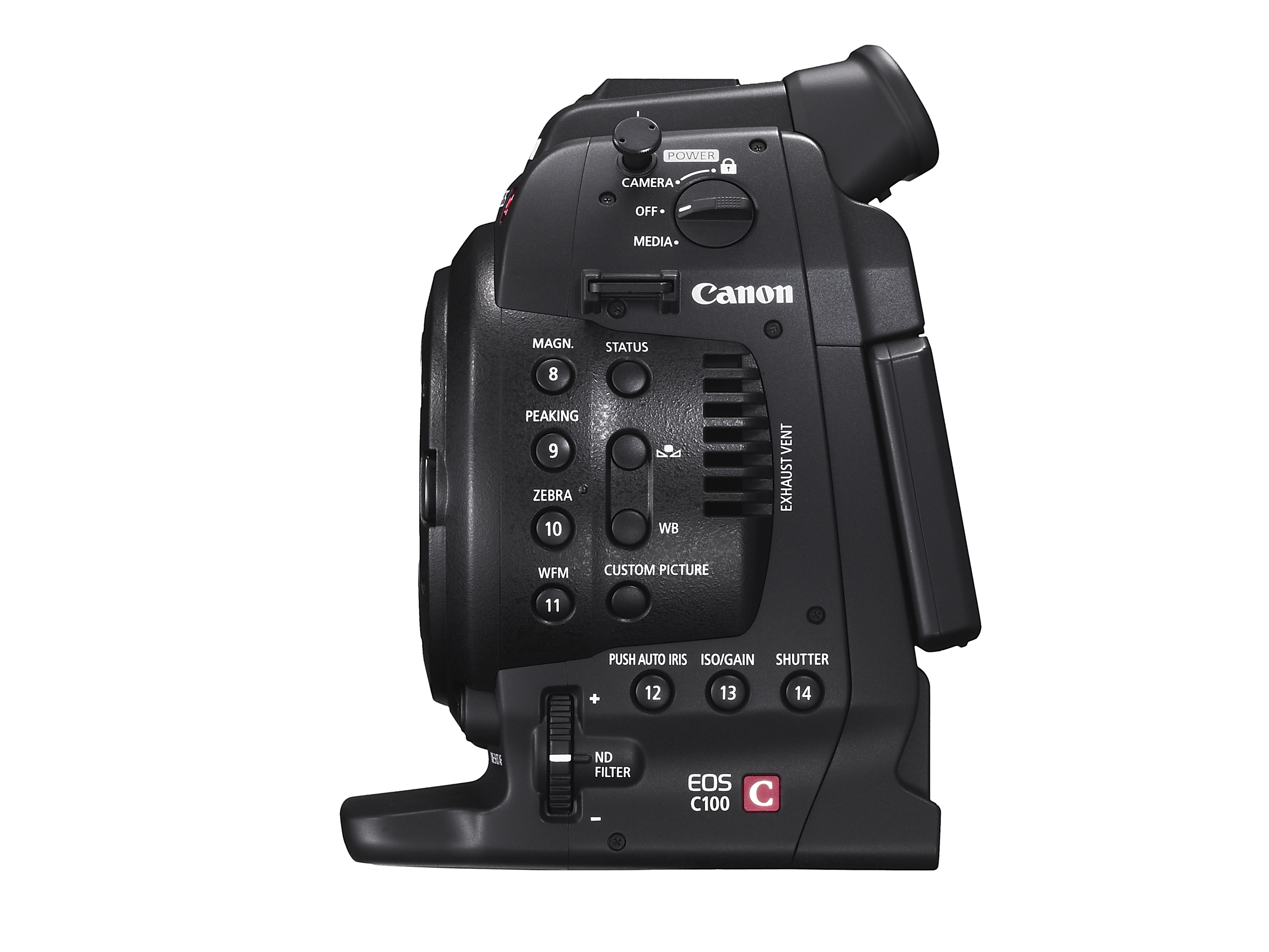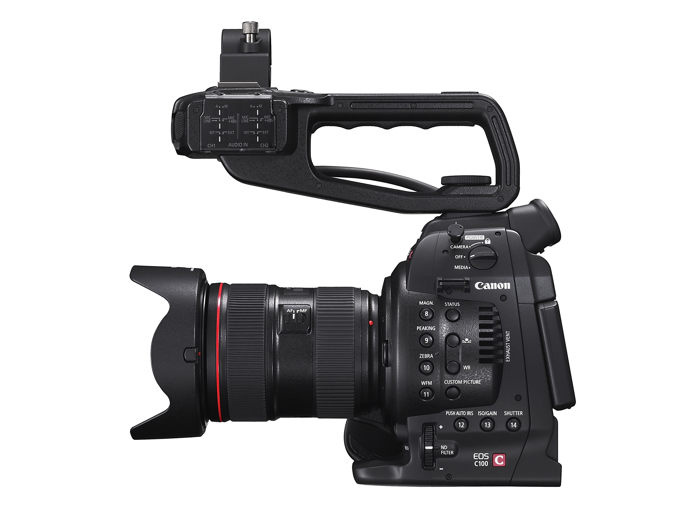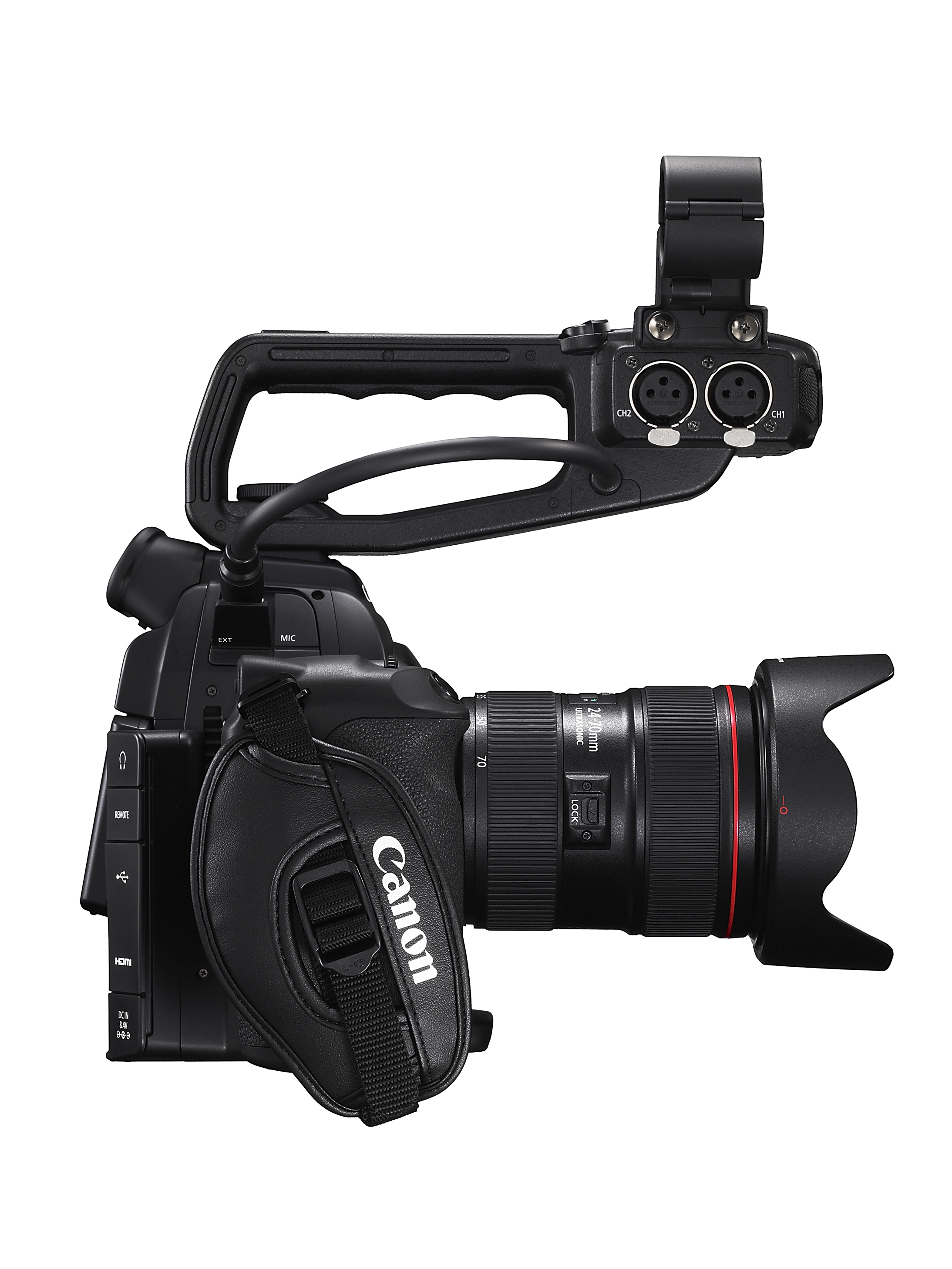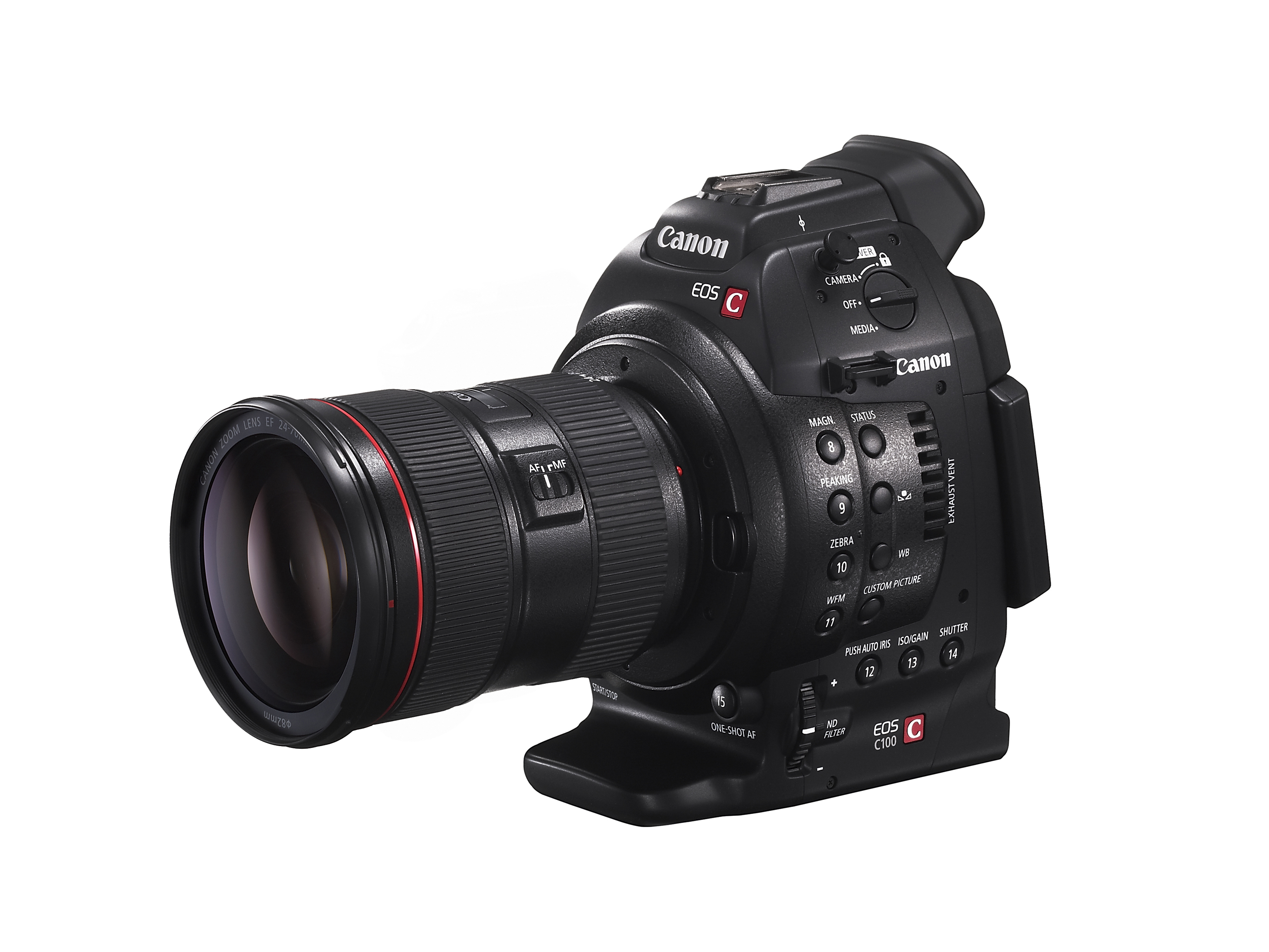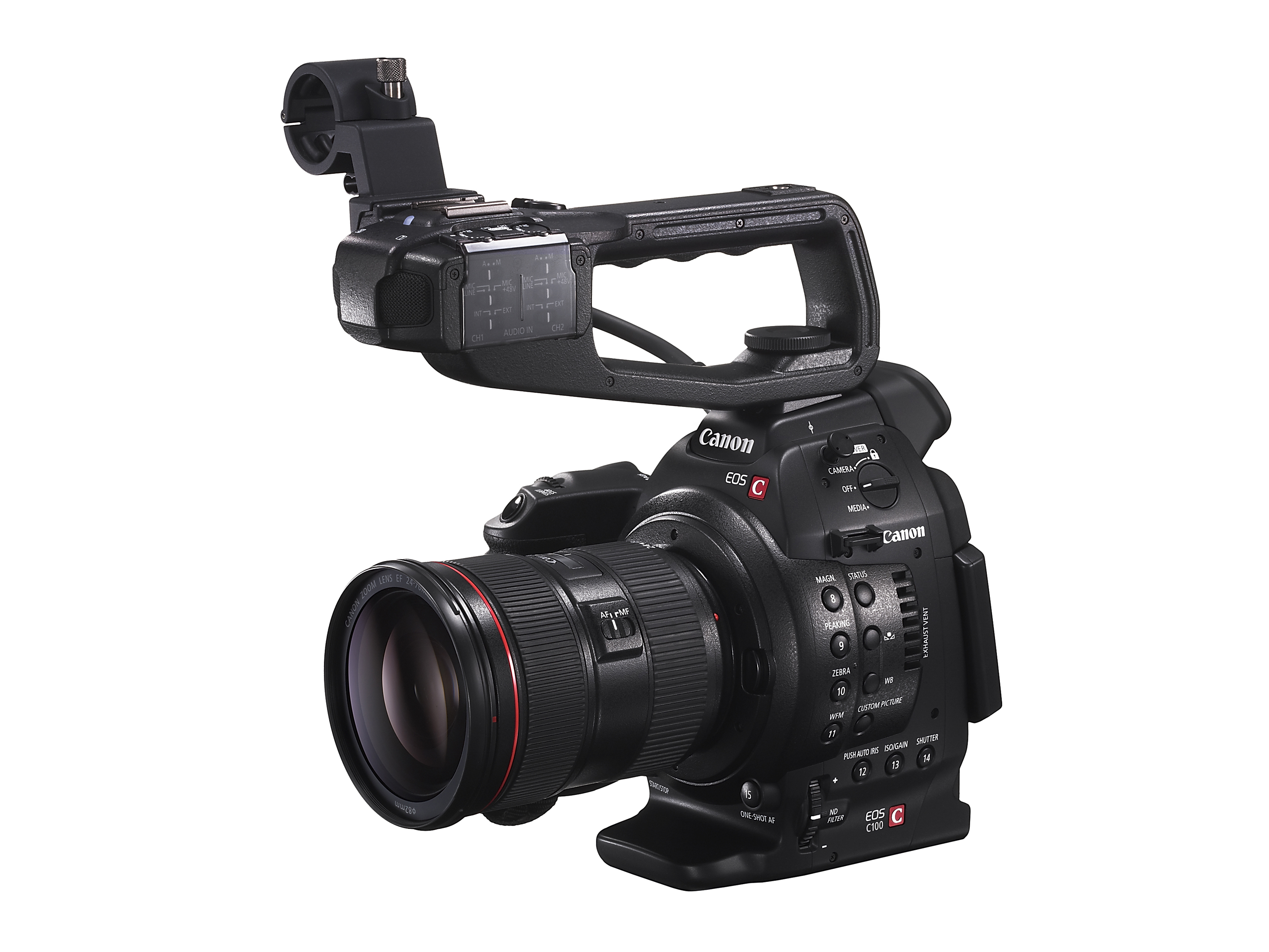 The EOS C100 digital video camera is approximately 85% of the size of the EOS C300 model, for maximum mobility. Designed for professional operability, the C100 includes a push auto iris function, one-shot auto focus (or full manual focus and exposure control), a multi-angle 3.5-inch LCD control panel, a high-resolution electronic viewfinder (EVF), built-in ND filters, dual XLR inputs, and a locking HDMI output. These features combine with such advanced technologies as reduced rolling shutter artifacts in 60i mode, enhanced gamma modes (including Wide Dynamic Range (DR) Gamma and Canon Log Gamma), cinematic depth of field characteristics, and excellent low-light performance. The C100 records to dual SD cards contributing to the camera’s reduced size and convenience.