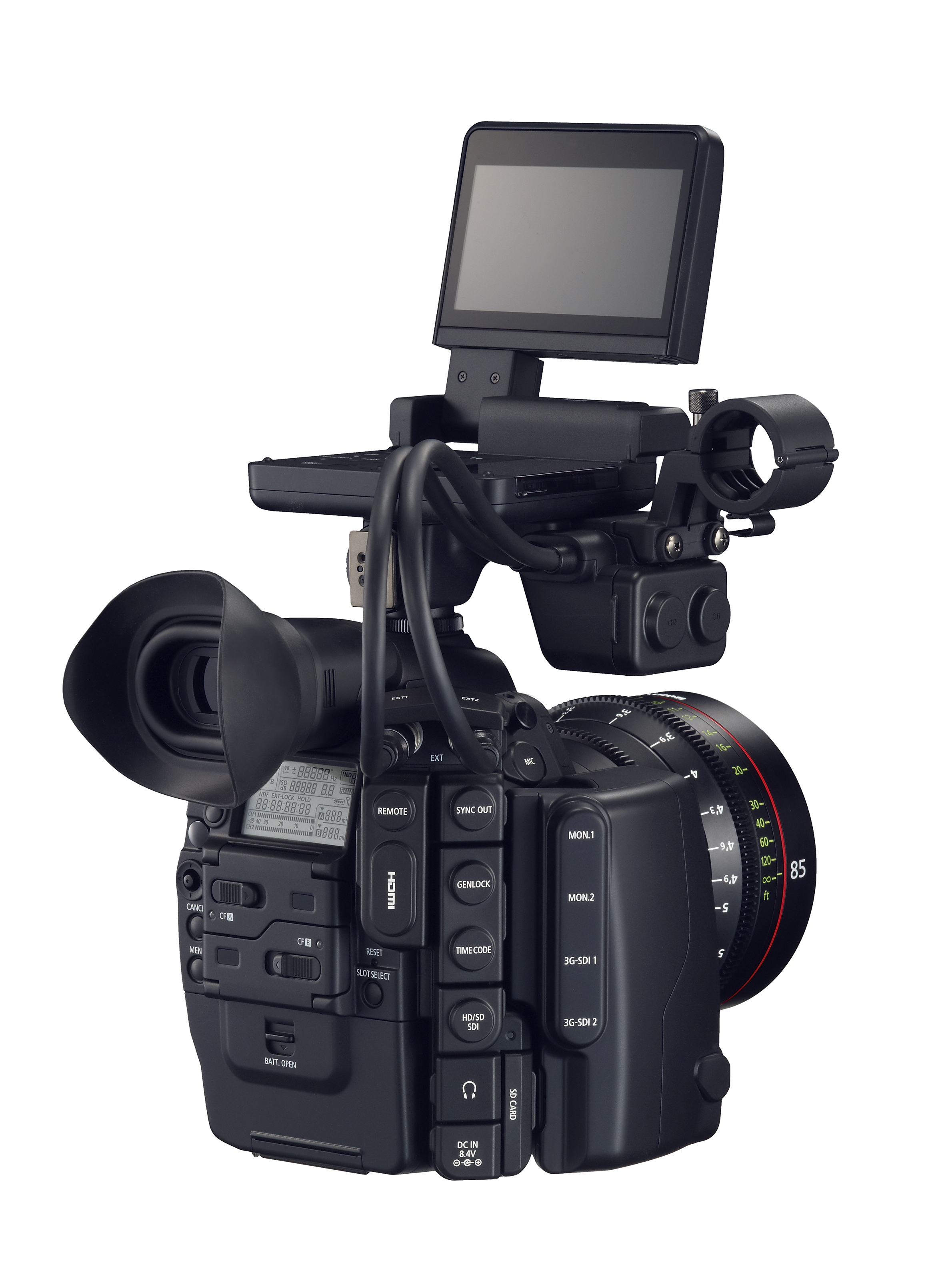 In addition to its ability to record to both SD cards simultaneously, or relay-record from one card to the other, the Canon C100 Cinema EOS camera can also output uncompressed digital HD to an external recording device via its locking HDMI connector. This HDMI output includes superimposed time code and 2:3 pull-down marker information. Additional outputs include a USB connector and stereo headphone jack.